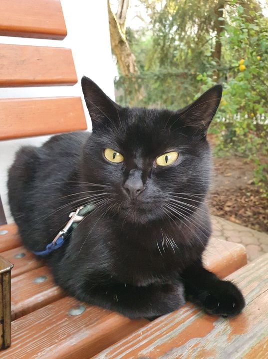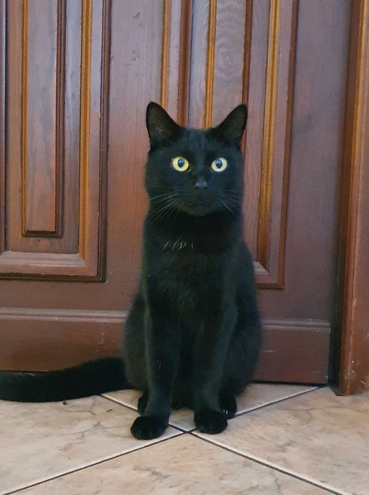Kotek jest dużym, czarnym kocurem o zielono-żółtych oczach i puchatej sierści.